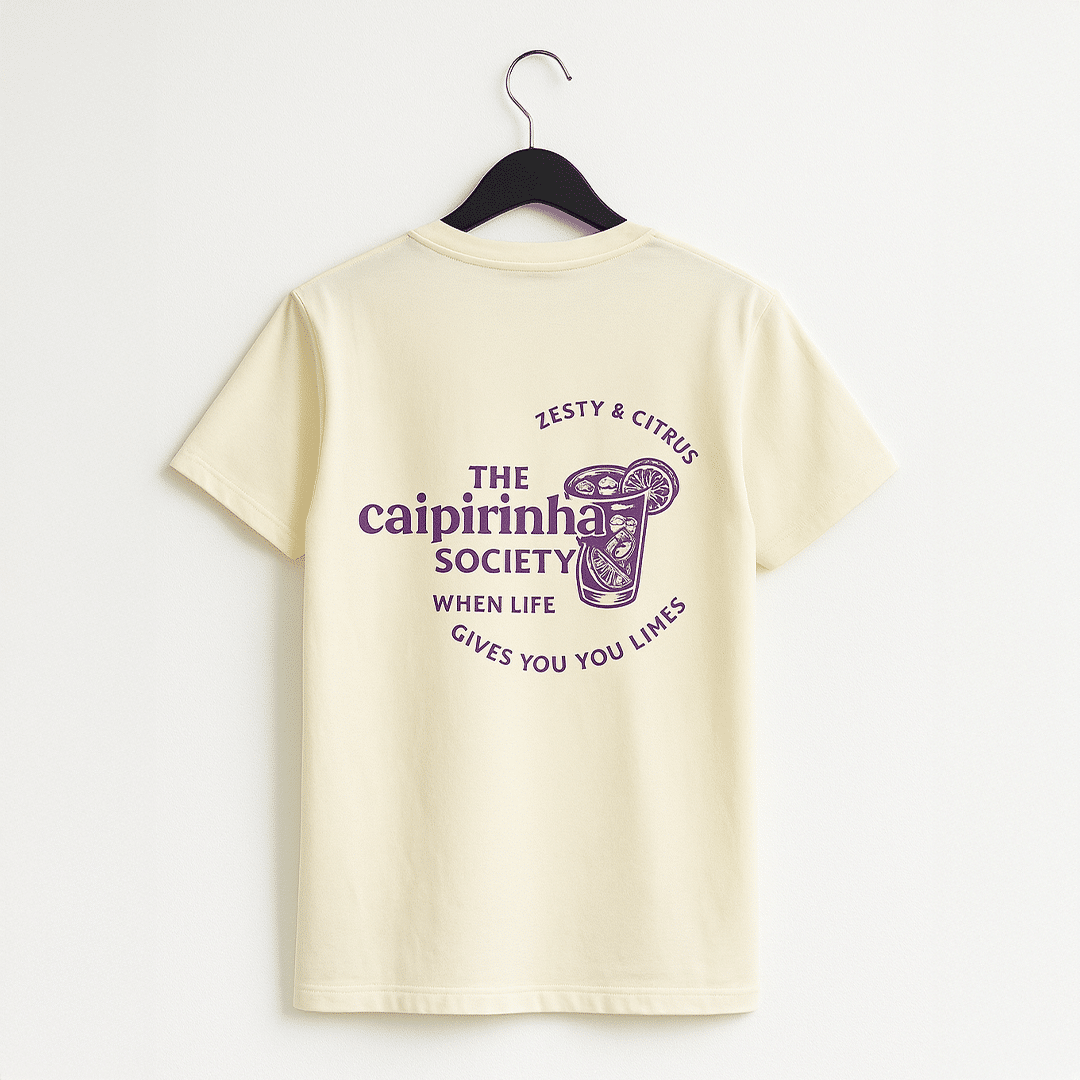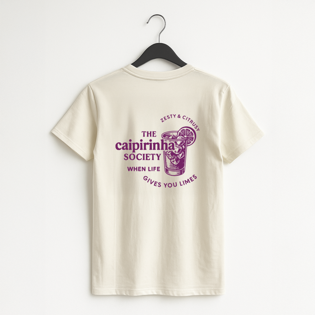 Avec son illustration vintage en violet profond, ce t-shirt rend hommage à l’esprit pétillant et ensoleillé de la Caïpirinha. Sur le dos, le visuel “The Caipirinha Society – When life gives you limes” donne le ton : citronné, cool et un brin second degré. À l’avant, un verre gravé avec soin vient signer le style avec finesse. Confortable, épais, unisexe, ce t-shirt est entièrement designé et imprimé à la main en France, pour une qualité aussi authentique que le cocktail lui-même.